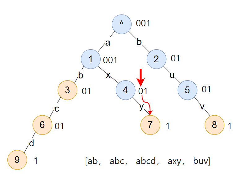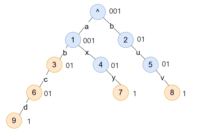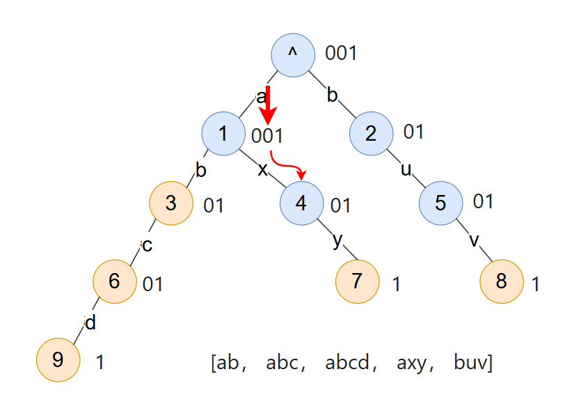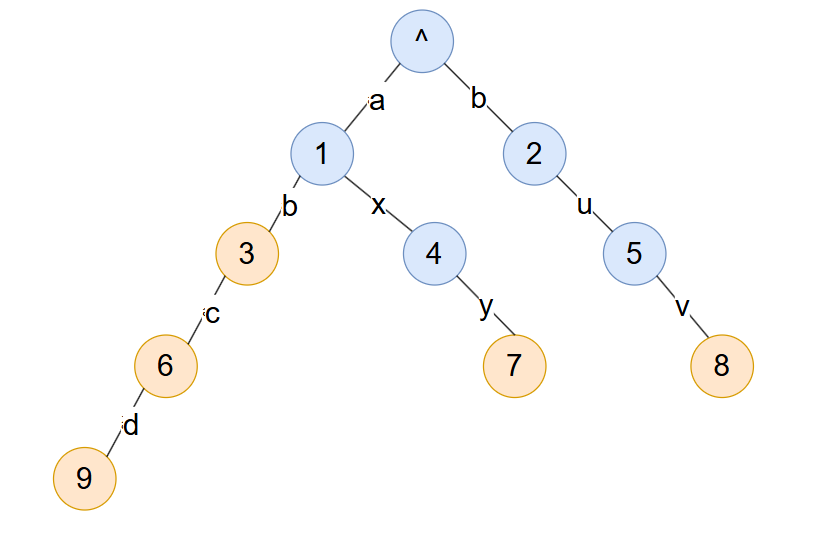 前缀树是一个高效的存储字符串集合的数据结构,通过同一个前缀共用节点来压缩信息,能够在随机的字符串集合中有着较好的压缩效率。举个例子,假设有一个字符串集合 [ab, abc, abcd, axy, buv] ,找这个集合构建的前缀树应该如下图所示。橙色的表示为叶子节点(定义为字符串结束)