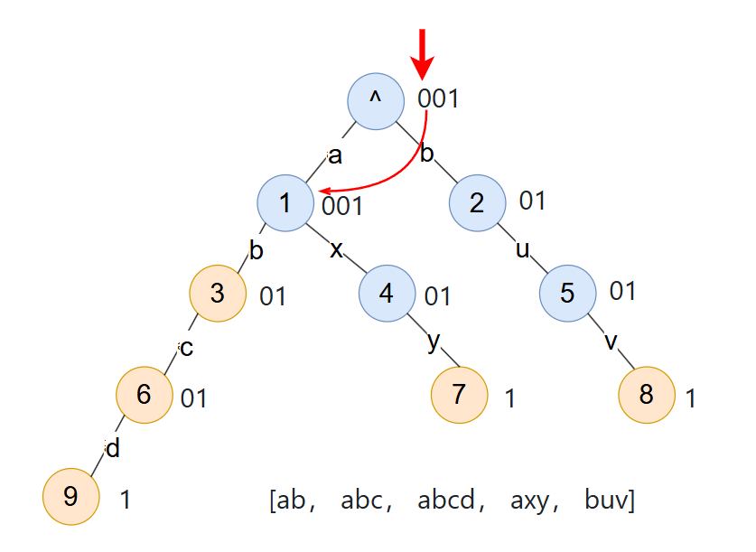 将整个前缀树按层序遍历拍平得到 001 001 01 01 01 01 01 1 1 1 。如下图所示