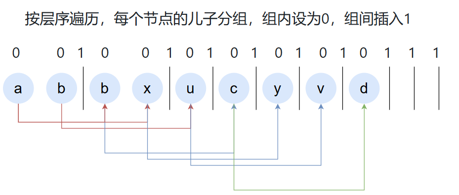 首先定义一个节点如何转化为一串字符,设节点有x个子节点,则该节点由x个0和1个1表示,最终如下图所示。