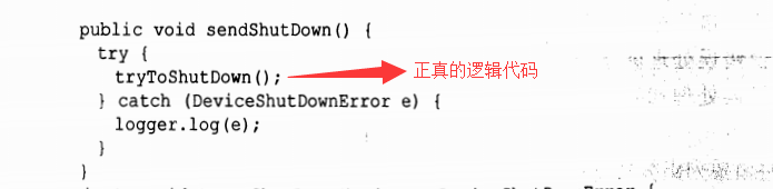 3.9.2 错误处理,就是一件事。即应该就是一个函数来处理。catch/finally 也不应该有其它的方法。(ps:经验告诉我有时候难以避免,例如打开了一个流,就得有一个关闭流的处理。)