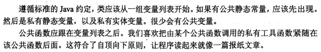 5、格式:大致的意思是,该换行就换行,该缩进就缩进,该对齐的就对齐(注意:等号右边,不要为对齐而对齐),该空格就空格,避免使用protected,实体变量放顶部,看起来整洁顺眼就行。有兴趣的可以自己阅读原文,这部分我建议同时要看《阿里巴巴Java开发手册》。注:《阿里巴巴Java开发手册》跟《代码整洁之道》内容并不是完全一样,差不多是相互补充的。