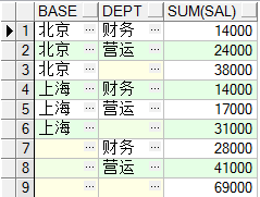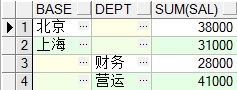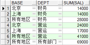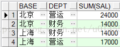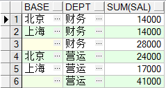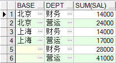 与group by rollup(dept,base)相比:去掉了最后一行的汇总,因为每次汇总要么是dept,base,要么是dept,null ,dept是固定的。