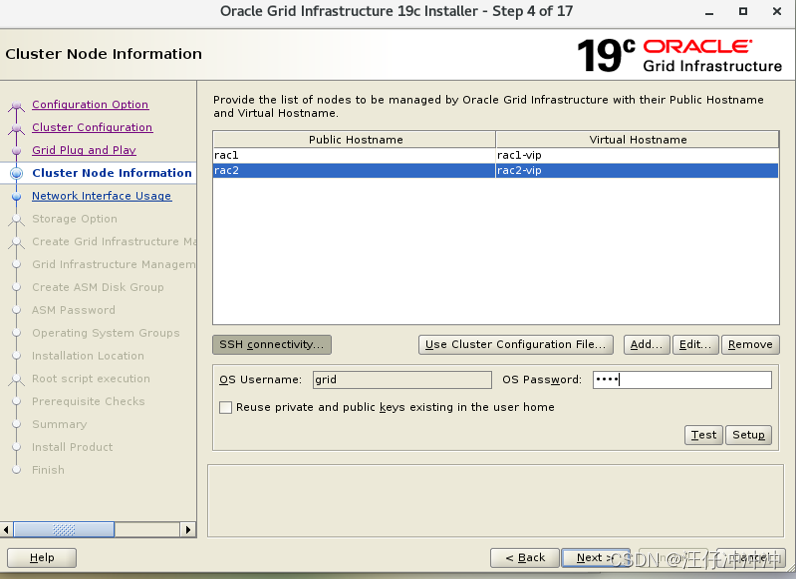 选SSH connectivity… 输入grid用户密码,选test-setup-下一步(test以下报错可忽略)