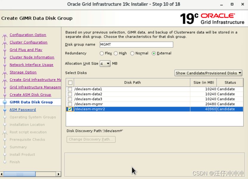 这个GIMR在12c和18c中是固定选项,在19c中回归可以自己选择是和11g一样还是选择GIMR(默认为不选择GIMR) ,如果选yes,下一步,是否要单独磁盘放gimr,选yes