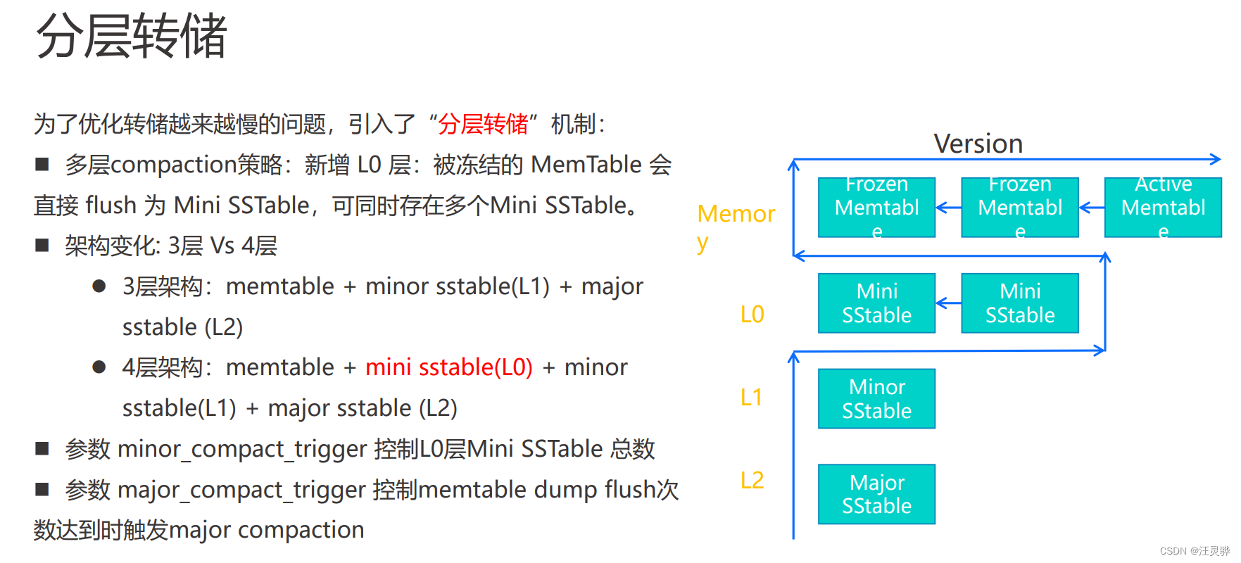 转储的概念就是做小版本冻结(minor freeze),冻结memtable(frozen memtable)直接flush为mini sstable,mini sstable个数由minor_compact_trigger参数决定,冻结memtable(frozen memtable)被清空重用。mini sstable写到minor sstable里,每次转储会将memtable数据与前一次转储的数据合并(merge),转储文件最终合并到sstable中。