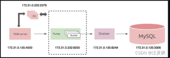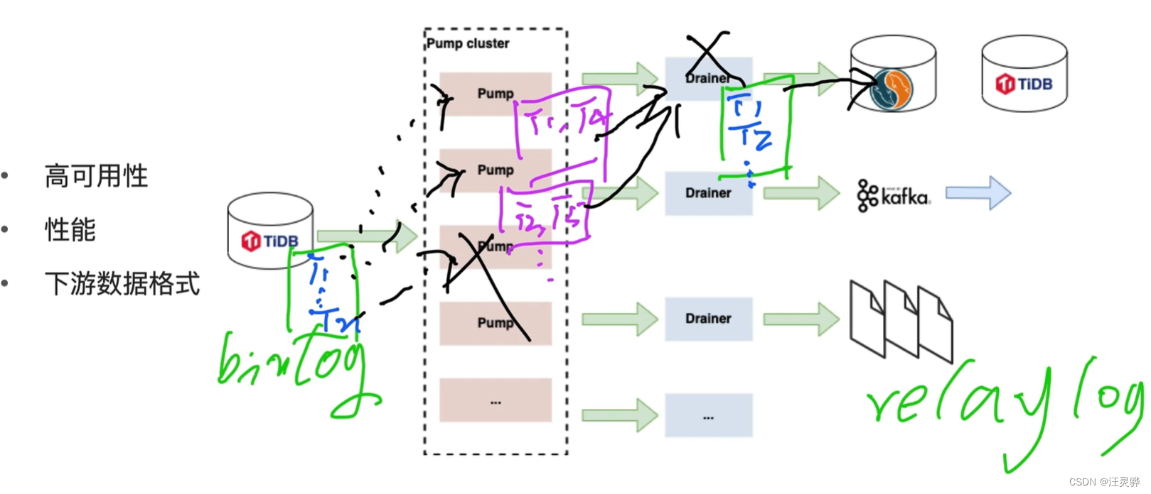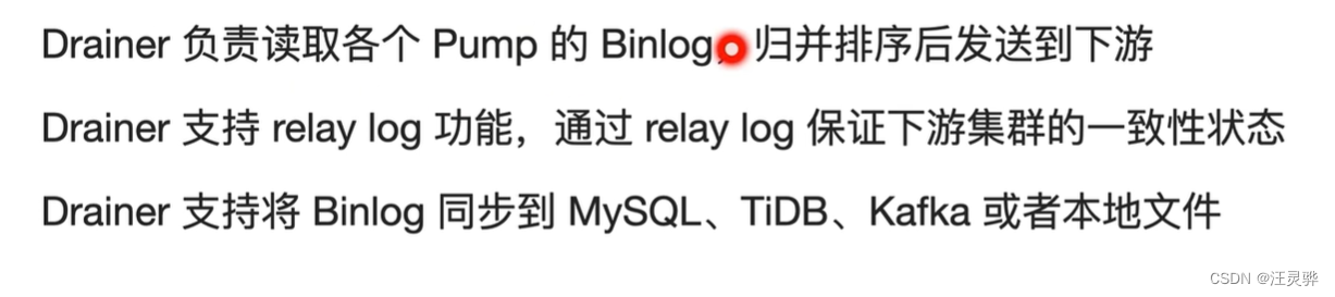 多个pump分散抽取tidb的binlog,drainer合并抽取的binlog,发送给下游