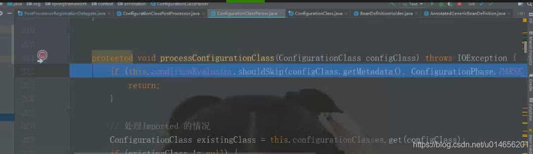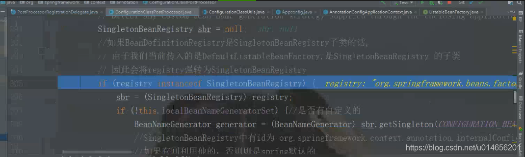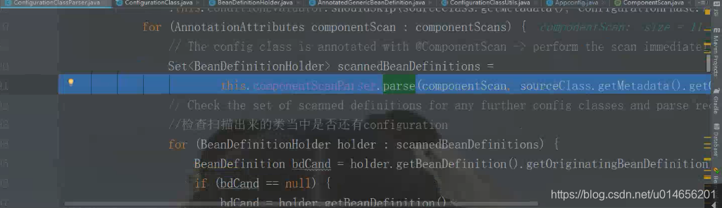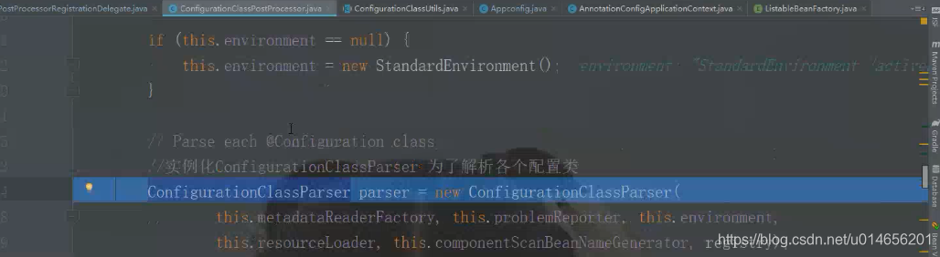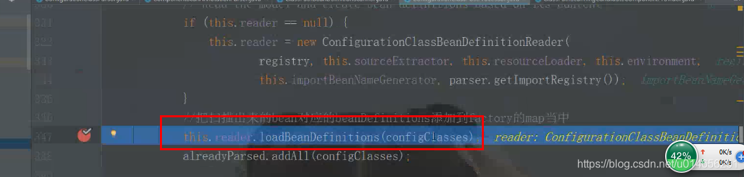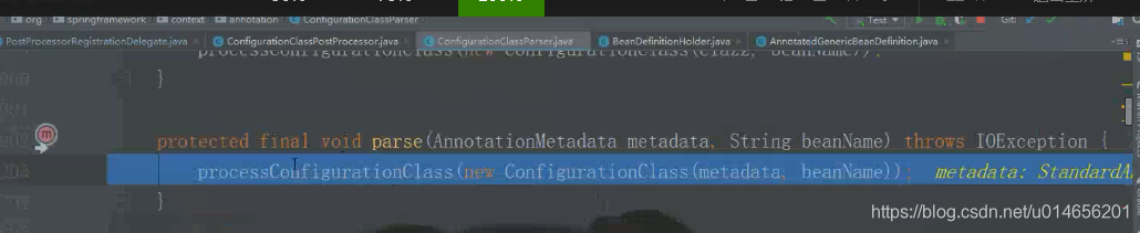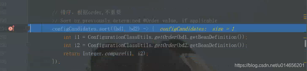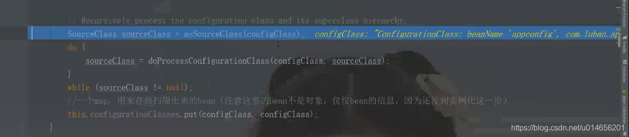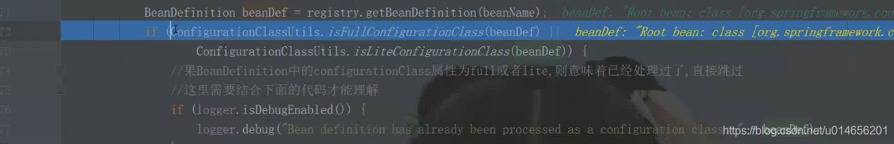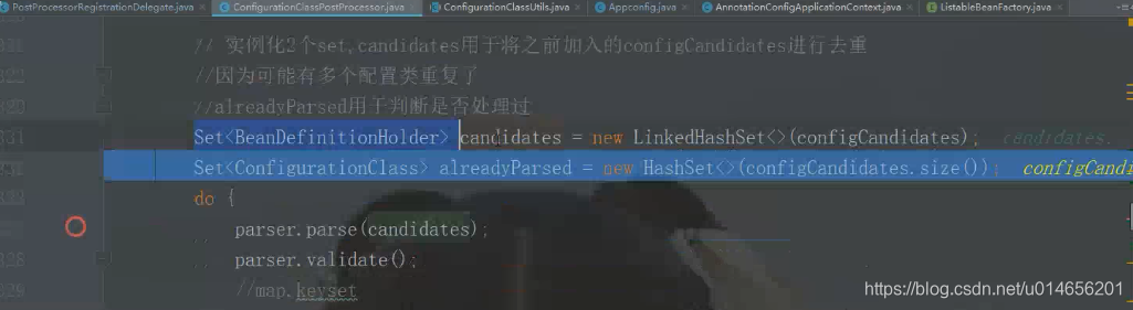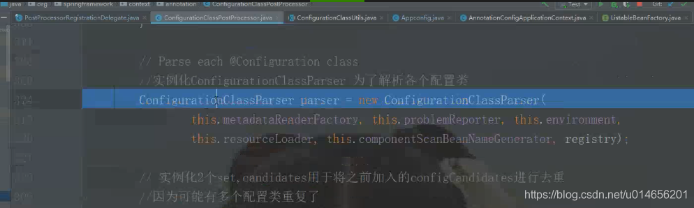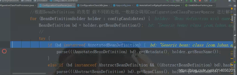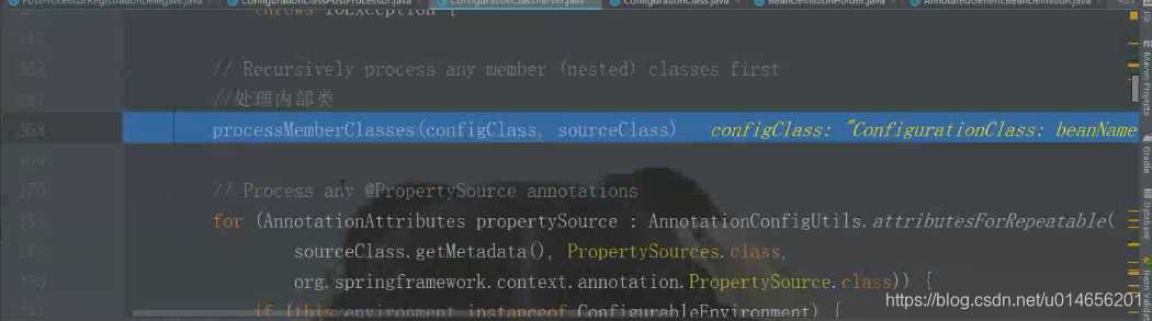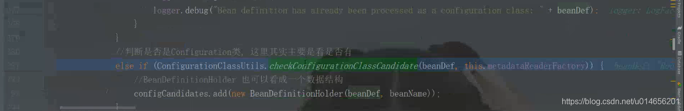 ConfigurationClassPostProcessor 继承了BeanDefinitionRegistryPostProcessor 的,所以调用了他重写父类的postProcessBeanDefinitionRegistry() 的方法。调用processConfigBeanDefinitions() 图46 的方法。