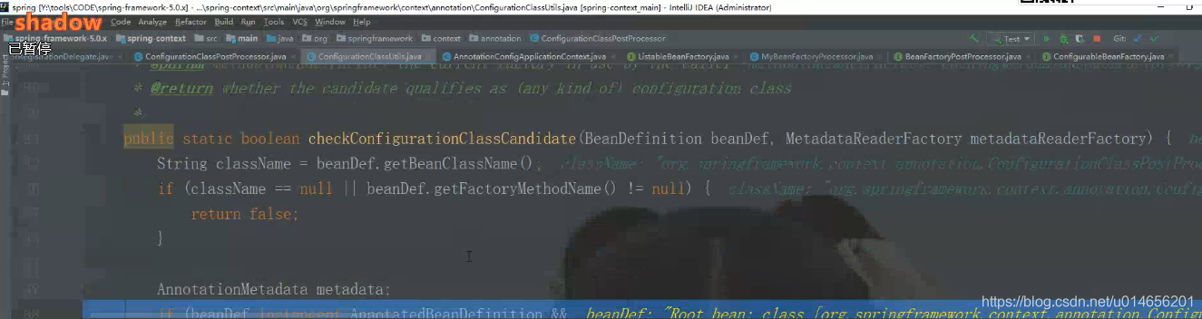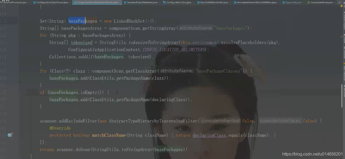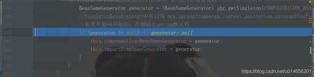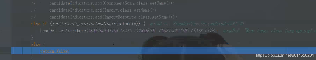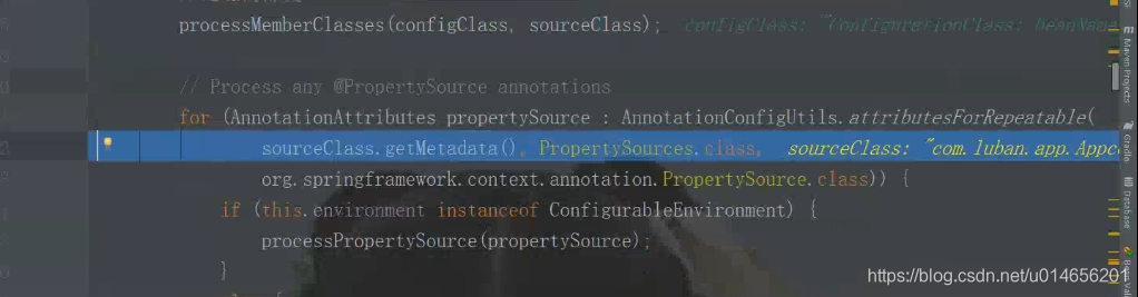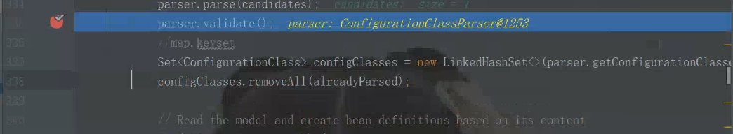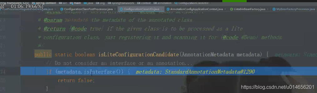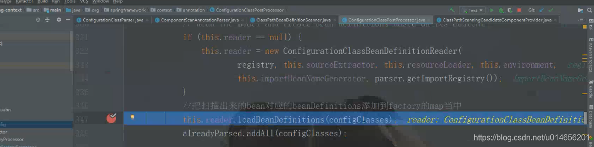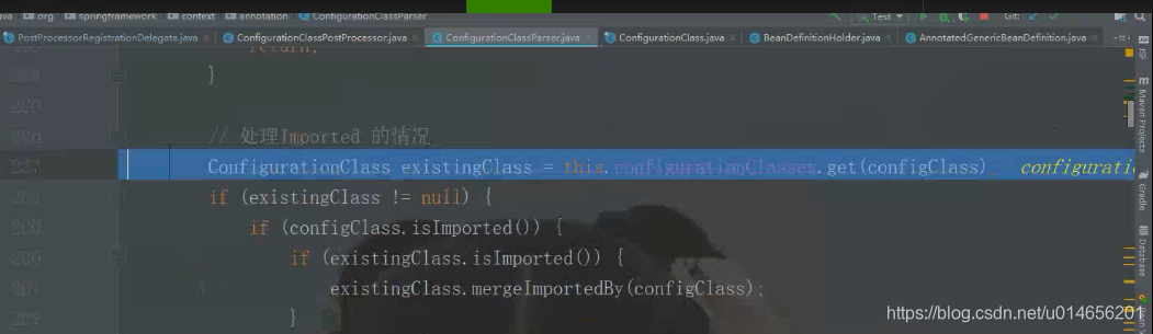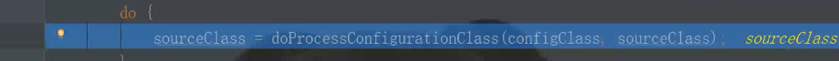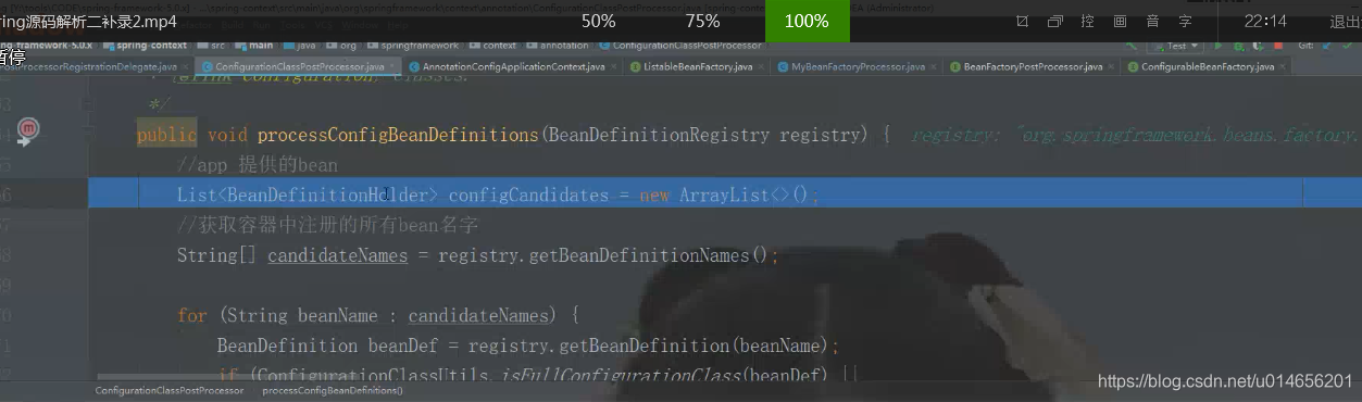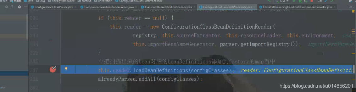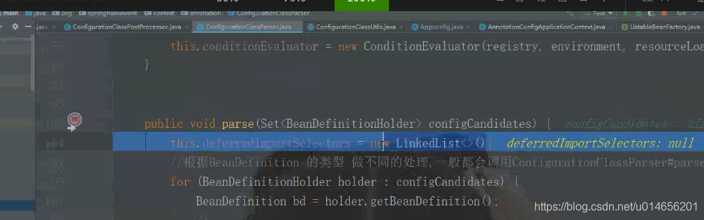 ConfigurationClassPostProcessor 继承了BeanDefinitionRegistryPostProcessor 的,所以调用了他重写父类的postProcessBeanDefinitionRegistry() 的方法。调用processConfigBeanDefinitions() 图46 的方法。