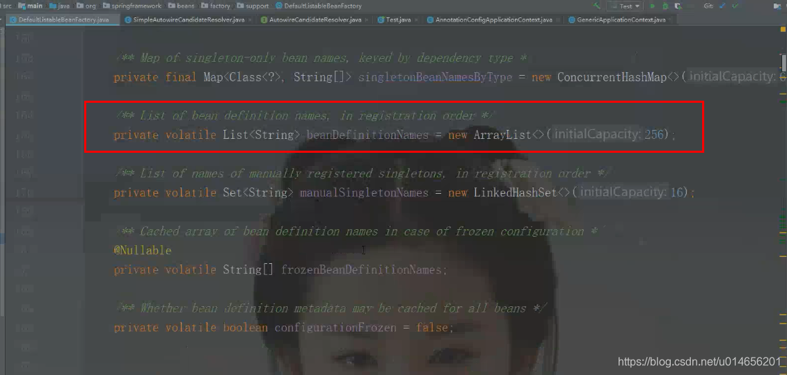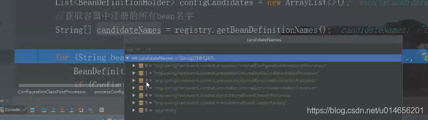 beanDefinitionNames的List。这个list中存在的bean的名称.