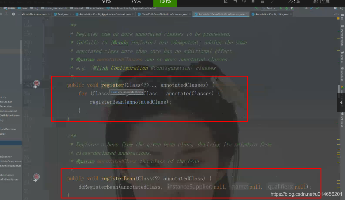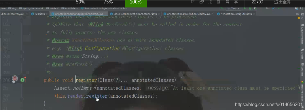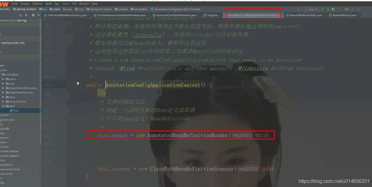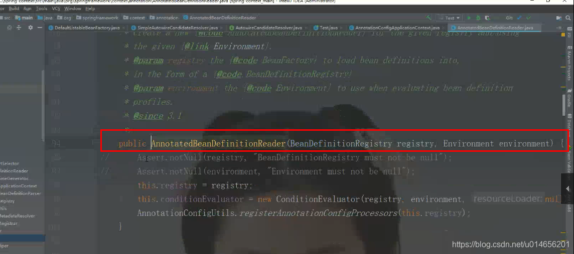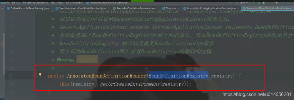 BeanDefinitionRegistry是一个bd的注册器. reader可以把一个user类转换成一个bd,但是需要通过beanDefinitionRegistry来放到beanDefinitionMap中。AnnotationConfigApplicationContext本身也充当一个注册器的角色。