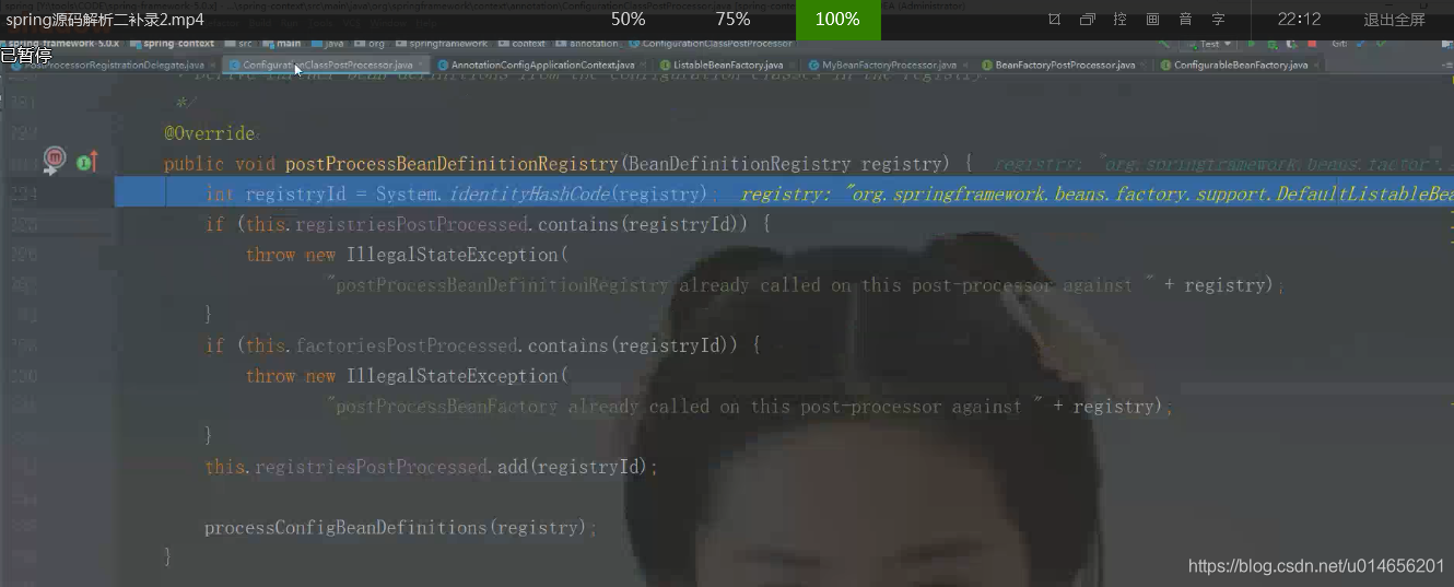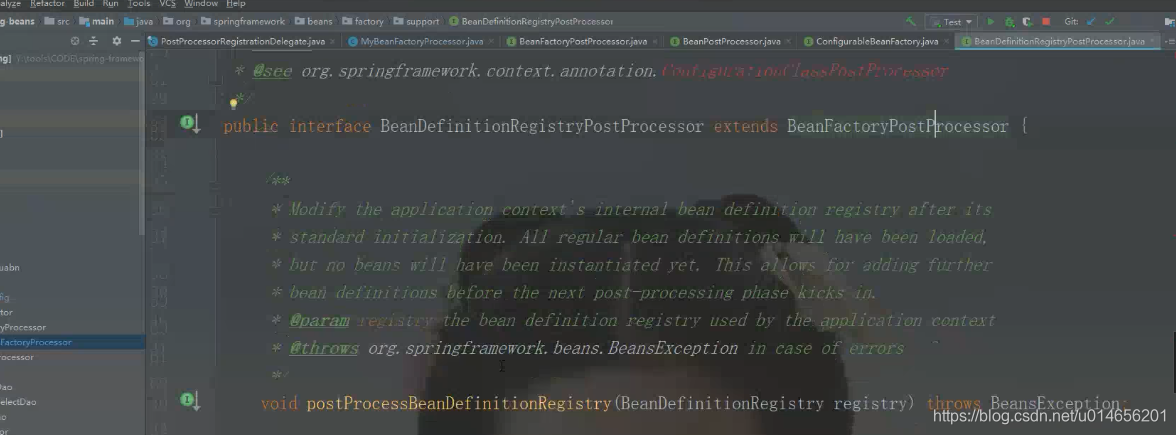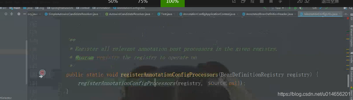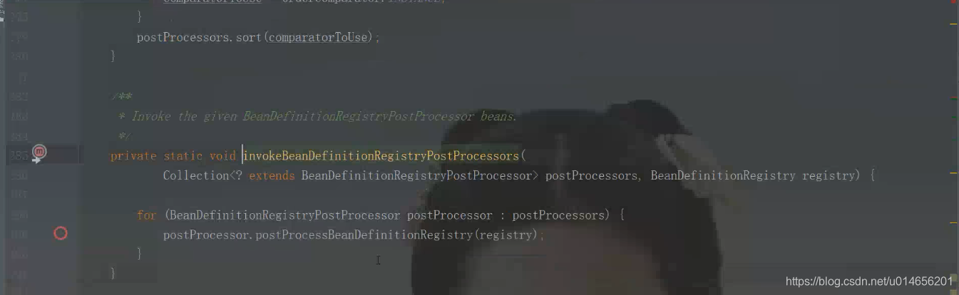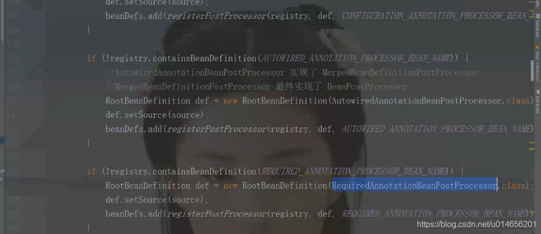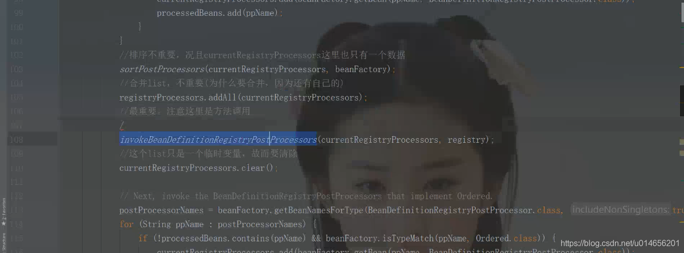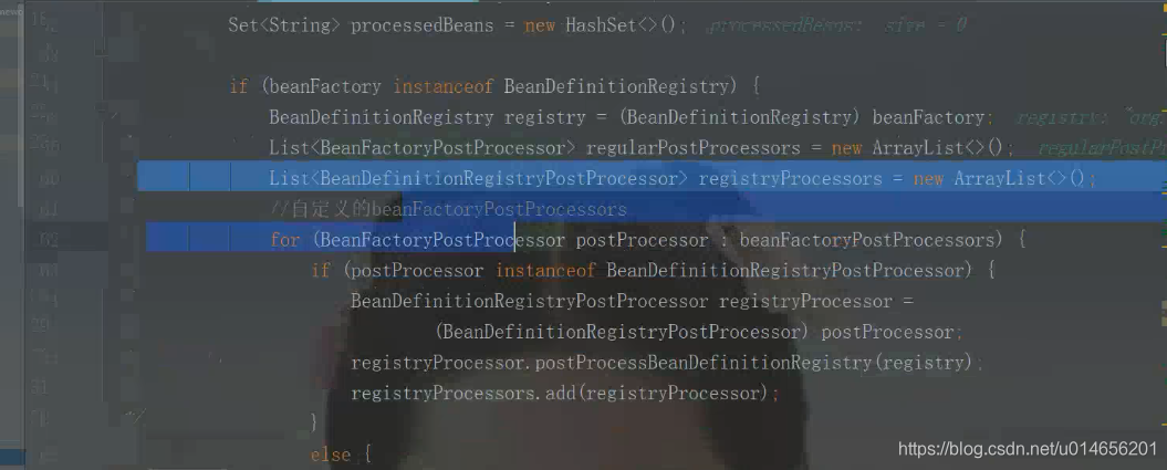 registryProcessors 它包含BeanDefinitionRegistryPostProcessor 对象的List ,目前只包含有可能是用户自定义的去实现了BeanDefinitionRegistryPostProcessor 接口的类,registryProcessors再把spring内部实现了BeanDefinitionRegistryPostProcessor接口的类添加进去。也就是合并List, 调用这个 invokeBeanDefinitionRegistyPostProcessors方法的意义是什么 图44