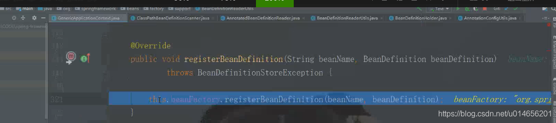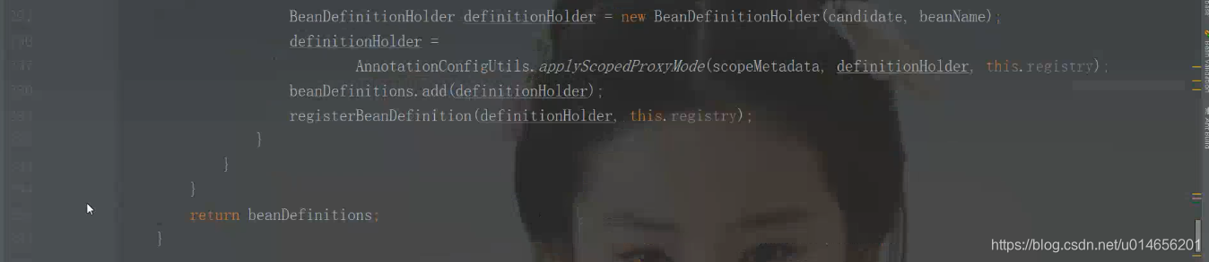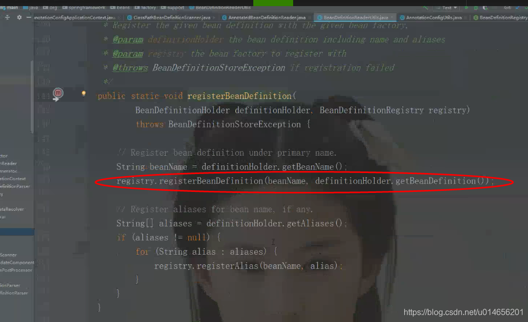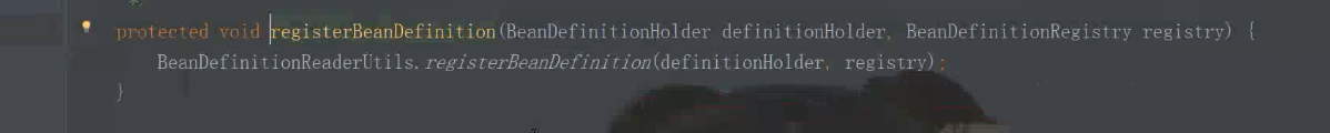 通过调用registerBeanDefinition(definitionHolder,this,registry)方法,