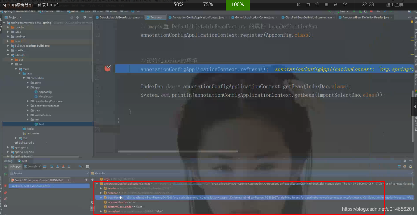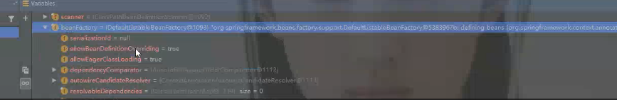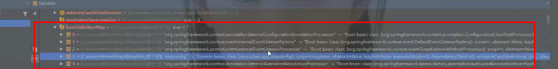 可以看到整体结构,AnnotationConfigApplicatIonContext 包含scanner, beanFactory ( 包括beanDefinitionMap (包含Appconfigbd 和 剩余的6个类))