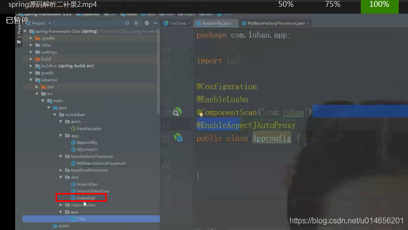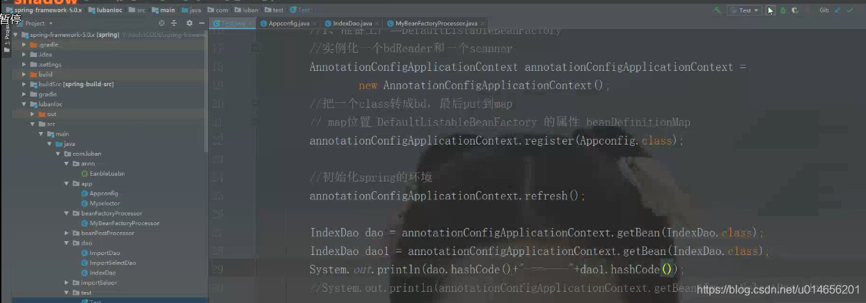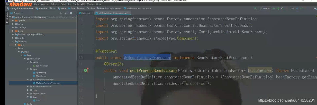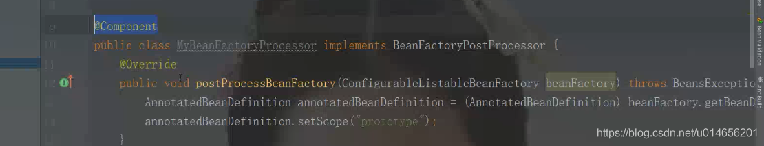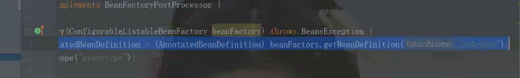 自定义一个MyBeanFactoryPostProcessor 类继承BeanFactoryPostProcessor接口,实现postProcessorBeanFactory方法。在方法中获取IndexDao类,并修改Scope为prototype。注意必须要加上注解@Componenet注解,来交给spring 管理。