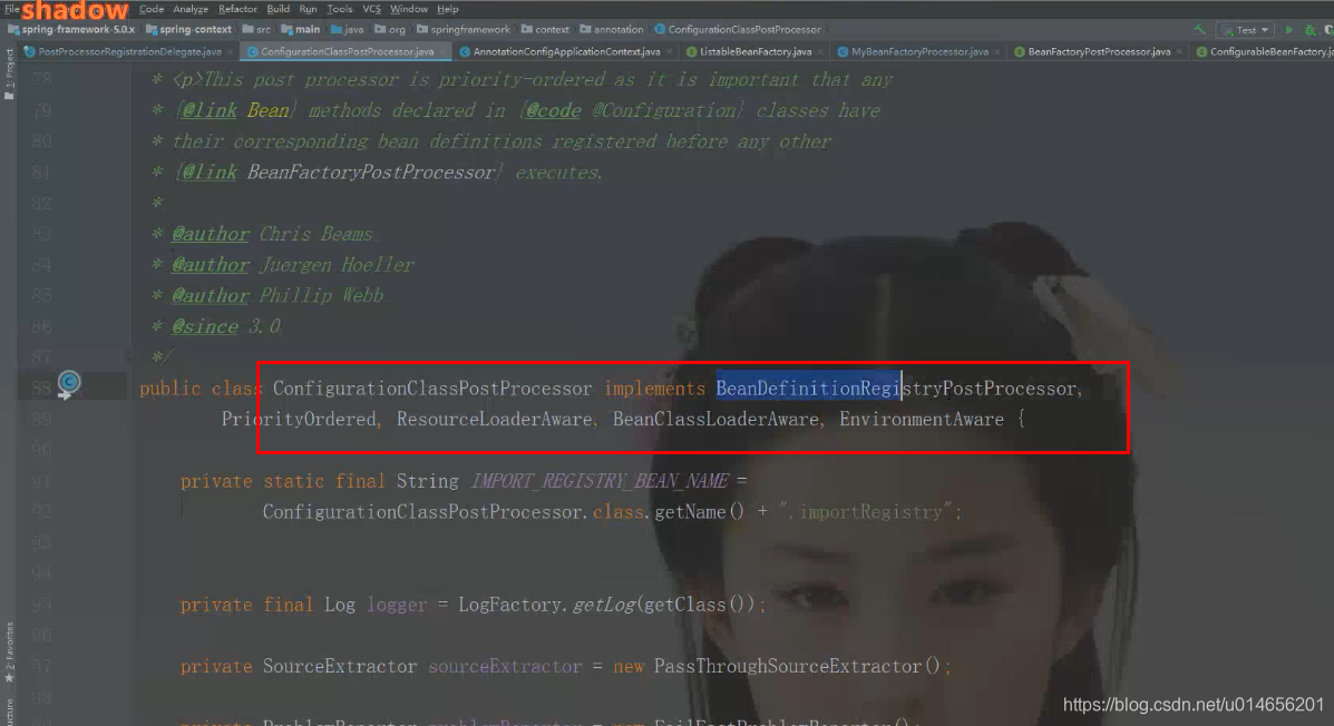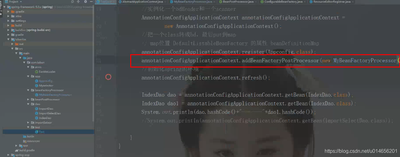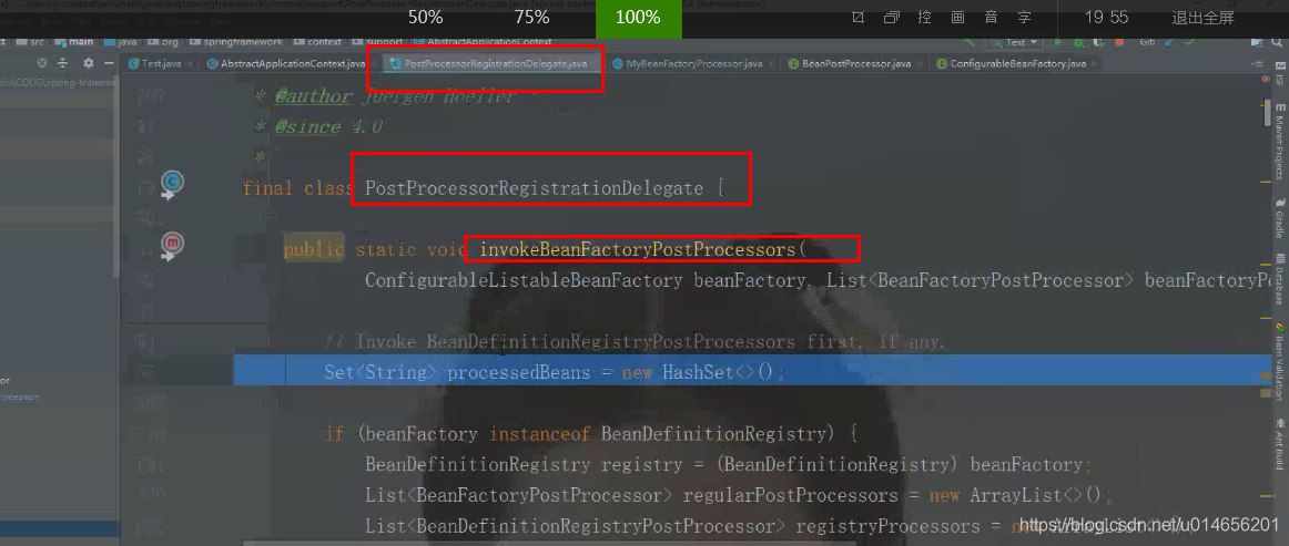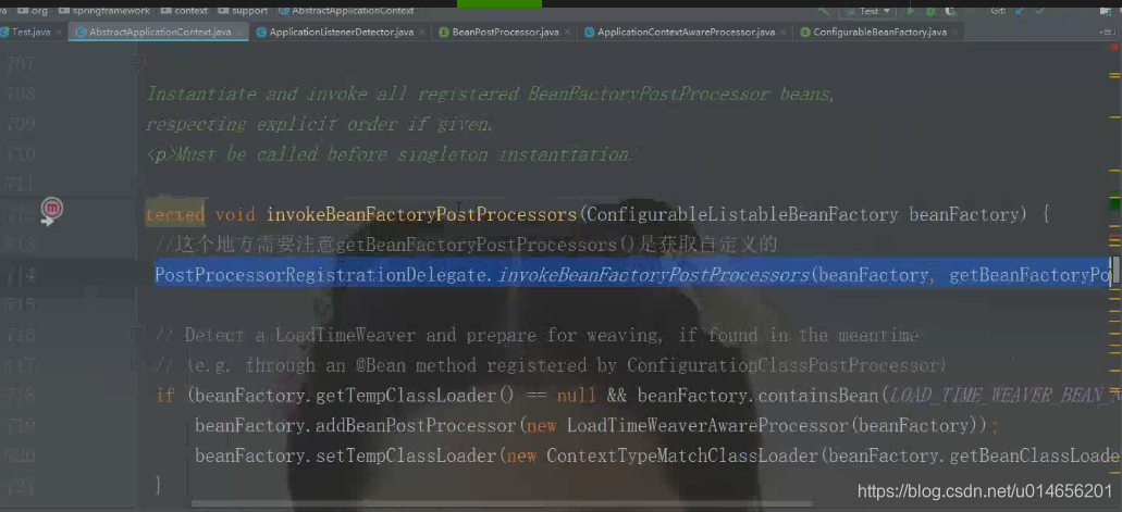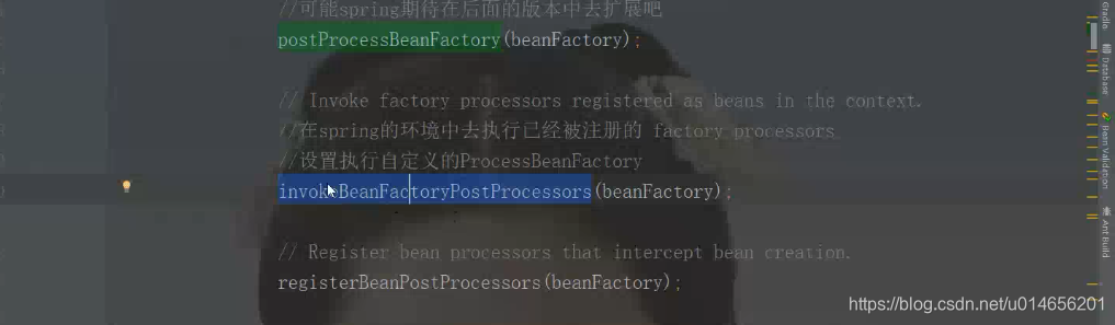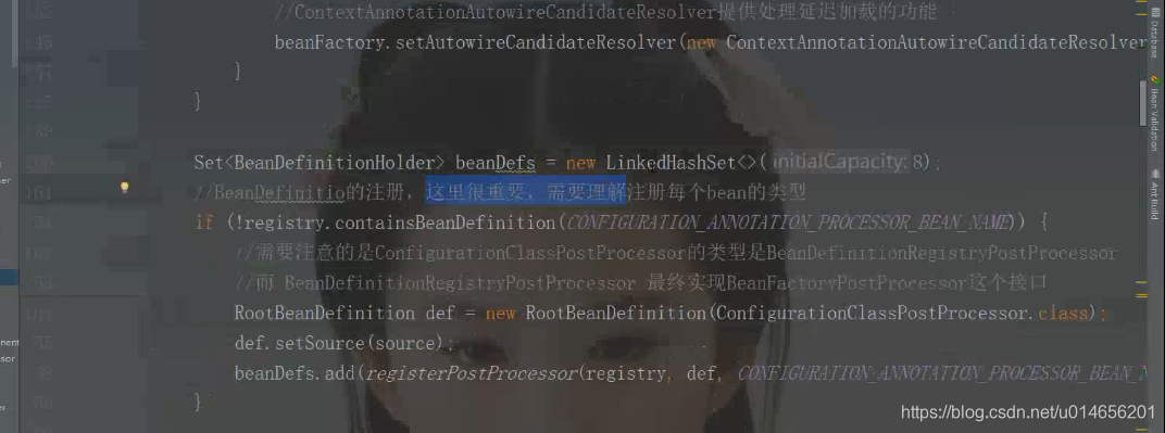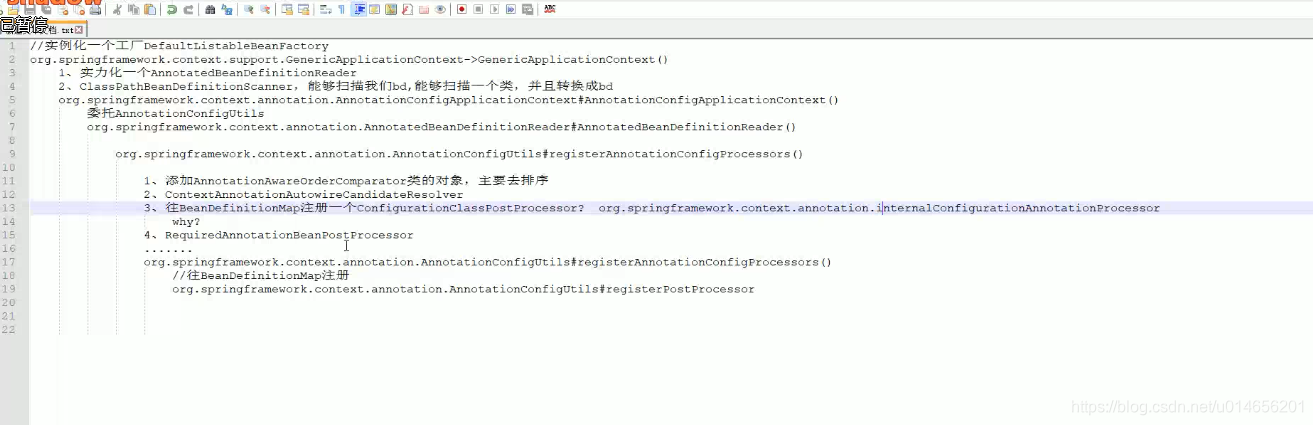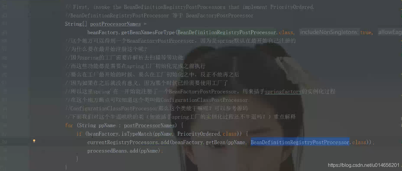 再想一个问题,ConfigurationClassPostProcessor 这个类为什么在最开始就被放到beanDefinitionMap中取呢?因为需要在invokeBeanFactoryPostProcessors方法中调用。invokeBeanFactoryPostProcessors 方法主要是factory在初始化的过程中去做一些事情,什么事情呢,就是委托多个实现了BeanDefinitionRegistryPostProcessor接口或者BeanFactoryPostProcessor接口的类来做一些事情,有自定义的也有内部实现的,其中ConfigurationClassPostProcessor就是spring内部 的实现BeanDefinitionRegistryPostProcessor 接口的类,如果在最初不添加,这里就没有办法委托ConfigurationClassPostProcessor来做一些事情了。