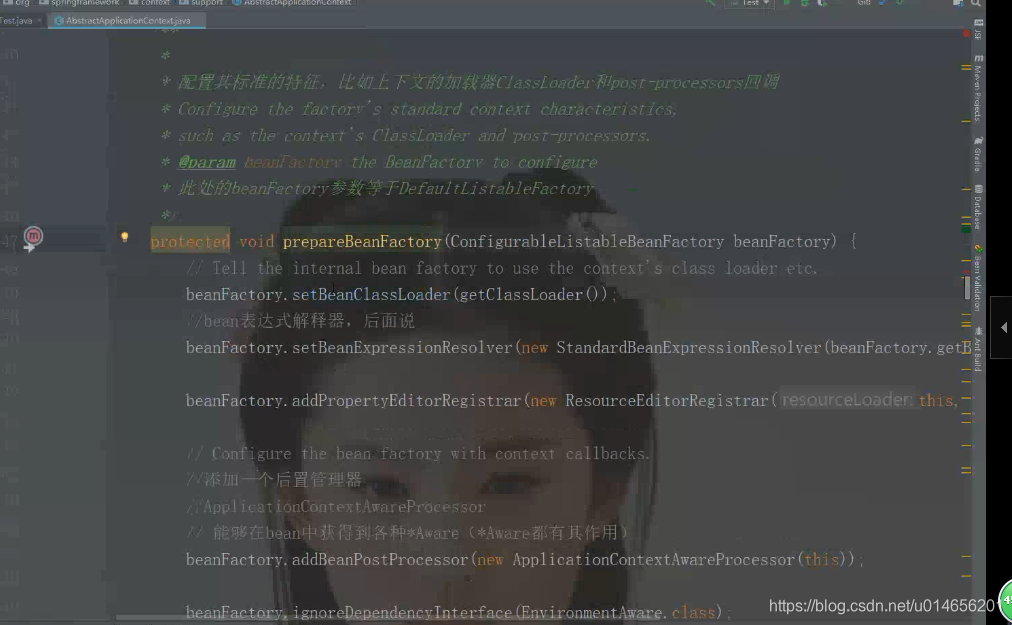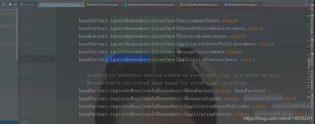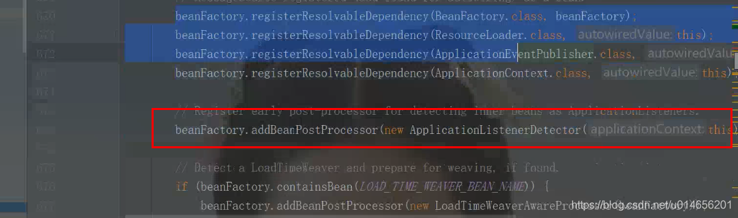 1.添加一个类加载器,2.添加bean表达式解析器,为了能够让我们的beanFactory能够解析bean表达式.3。添加一个后置处理器,ApplicationContextAwareProcessor类型。 beanPostProcessor 是一个List ,能够插手bean实例化过程。目前springFactory只是维护了一个BeanPostProcessor的list的后置处理器,目前还没有用到。在bean实例化过程中会依次遍历执行list的后置处理器,来达到插手实例化的目的。4.添加自动注入被忽略的列表。5 ,registrerResolvableDependency 后续讲解。6. beanFactory添加一个ApplicationListenerDetector 的后置处理器,这个不重要。剩下的是spring的一些标准特征不重要。