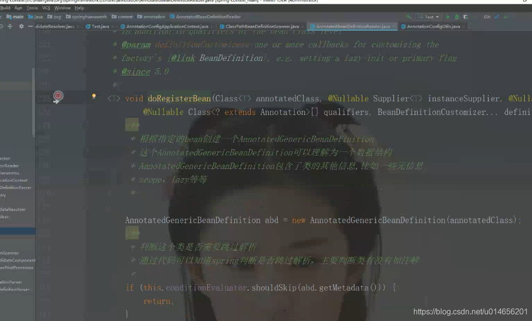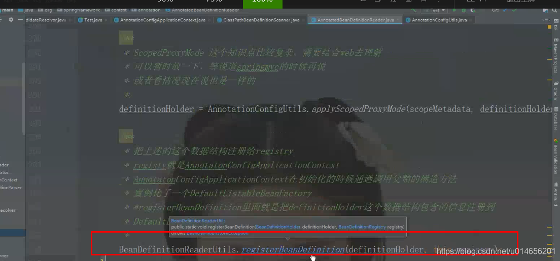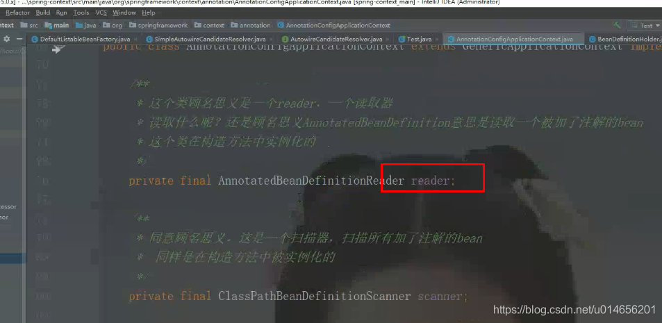 在 AnnotationConfigApplicationContext类里有一个属性reader(beanDefiainition简称bd,reader就是bd读取器),reader的作用是 把一个普通对象转换成beanDefainition对象(AnnotatedBeanDefinitionReader 只能读取加了注解的)。例如 reader可以把一个加了注解@Server的对象User 转换 成一个beanDefainition对象,为什么要转换成beanDefainition对象呢,因为beanDefainition对象是spirng用来描述一个bean的对象,类似java中用Class来描述一个对象。beanDefainitiion对象里包含了,是否是单例,是否是懒加载,是否加注解等等。那么user变成beanDefainition对象后,就表示他默认不是懒加载,是单例,是加了注解等等,是不是比class描述的更加全面了。