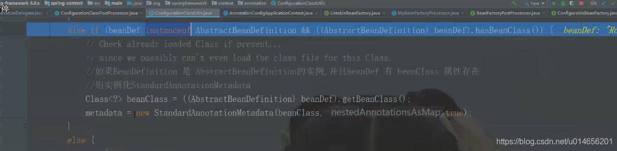 判断registry是否包含图11这个类,第一次走的时候肯定没有,所以返回false,去false的!操作。进入if块中,RootBeanDefinition 是BeanDefinition的子类(表示是spring内部提供类)。通过构造器的方式转出成bd。例如 这个RootBeanDefinition类 就是把ConfigurationClassPostProcessor类型转换为RootBeanDefinition类型注册到BeanDefinitionMap中。