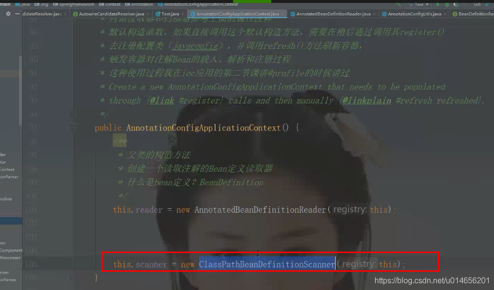 在new AnnotatedBeanDefinitionReader(tihis) (图6),这个this 代表当前对象AnnotationConfigApplicationContext对象,至少证明BeanDefinitionRegistry对象和 AnnotationConfigApplicationContext要么相当,要么存在父子关系BeanDefinitionRegistry 是父亲。