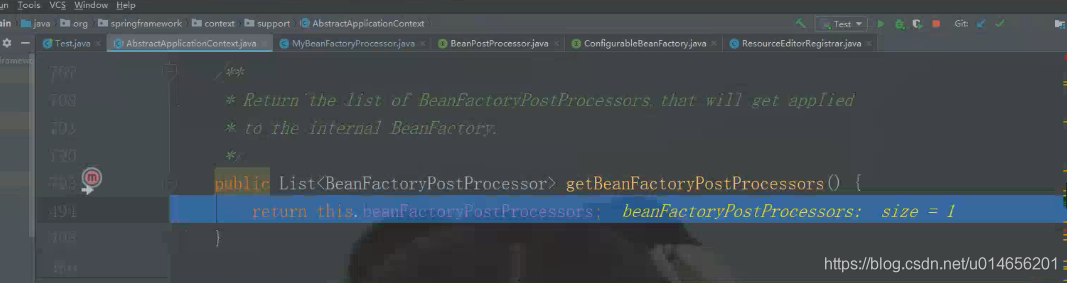 getBeanFactoryPostProcessors() 获取自定义 BeanFactoryPostProcessors。 什么称为自定义的就是程序员自己写得,没有交给sping管理,更直白的说就是没有加上@Component注解的。