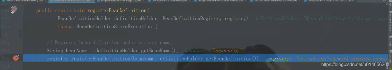 通过registry的registrerBeanDefinition()方法向beanDefinitionMap中put一个beanName和beanDefinition. 这个beanDefinition 是(ConfigurationClassPostProcessor)转换来的。最终返回一个BeanDefinitionHolder对象。