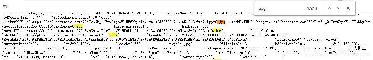 我这边只放三个,我们会发现这一块代码指向的都是同一张图片,只是图片的大小不一样,那么对应的就是图片的原链接,图片的小图,当鼠标移上去显示的图片等等等等,这个可以自行百度,所以我们需要找到最大的那一张,就是 "objURL" 所保存的,那么我们匹配的也就是这个;