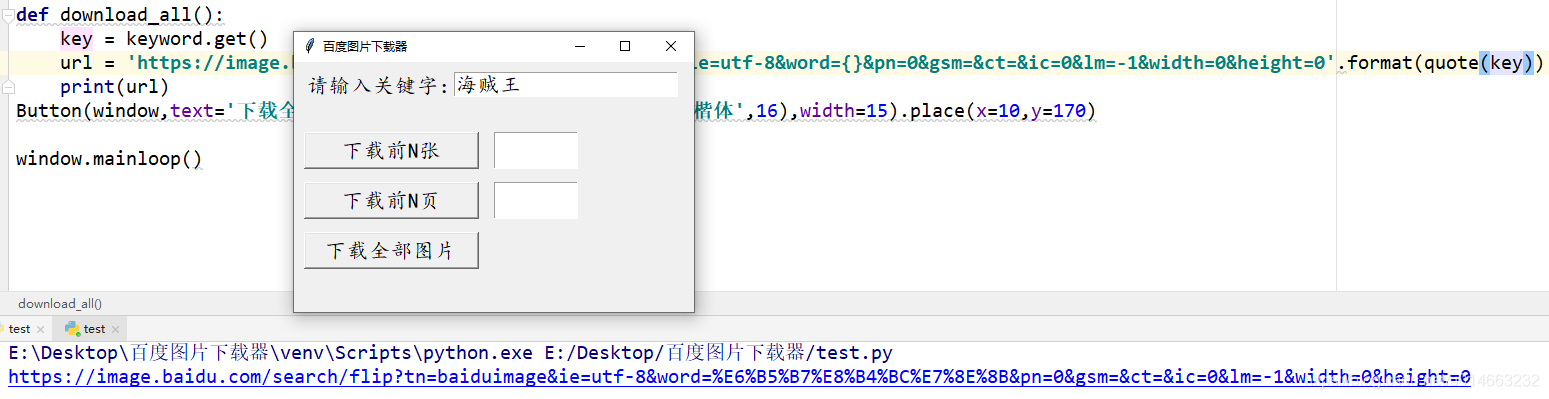 这一步其实很简单通过get()方法获取输入框的值,然后用quote()方法对其进行编码,最后合成就是我们需要的网址了,注意:quote()方法是urllib中的一个方法,这个库是自带的,不需要我们安装,我们直接导入使用就好 from urllib.request import quote ;