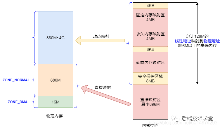 前面已经说过,内核空间的总大小 1GB,从内核空间起始地址开始的 896MB 的限行地址可以直接映射到物理地址大小为 896MB 的地址区间。