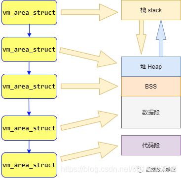 在前面「进程与内存」章节我们提到,Linux 进程可以 划分 5 个不同的内存区域,分别是:代码段、数据段、BSS、堆、栈,内核管理这些区域的方式是,将这些内存区域抽象成 vm_area_struct 的内存管理对象。