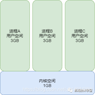 4GB 的进程虚拟地址空间被分成两部分:「用户空间」和 「内核空间」: