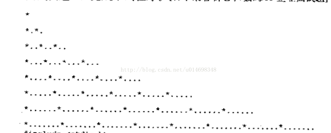 public class Print { public static void main(String[] args) { for (int i = 1; i <=8 ; i++){//以为要输出八行所以我另i从1增到8 StringBuilder stringBuilder = new StringBuilder(); for (int m = 1; m <= i; m++){ stringBuilder.append("*"); for (int l = 1; l <= i - 1; l++){ stringBuilder.append("."); } } System.out.println(stringBuilder.toString()); } } }