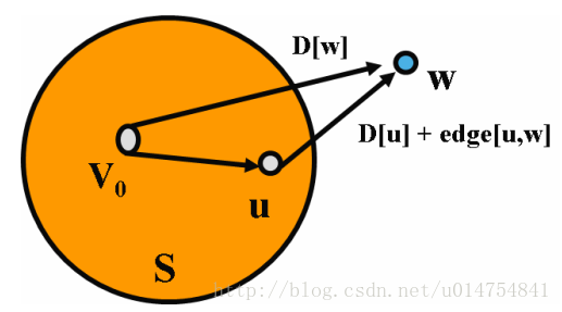 算法的精髓:S 集内的顶点是已经找到最短路径的顶点,V0 到 w 的最短路径只能通过 S 集内的顶点。