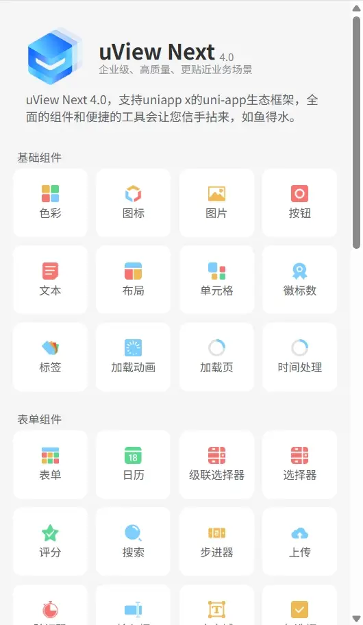 uView Next 4.0 在3.x版本的基础上使用vue3 + uts + 组合式进行了全面的重构,支持uni-app、uniapp x、鸿蒙、微信小程序,做到了全端兼容。