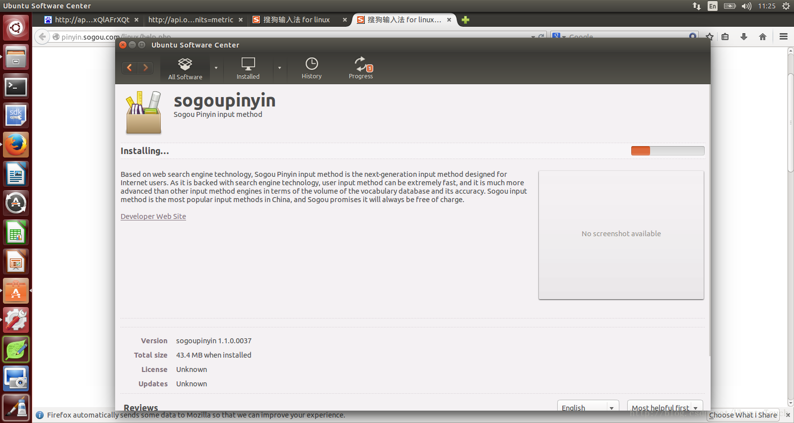 我们可以看到系统会自动调用“Ubuntu Software Center”来安装已经下载的sogoupinyin软件。我们等待其安装完成。