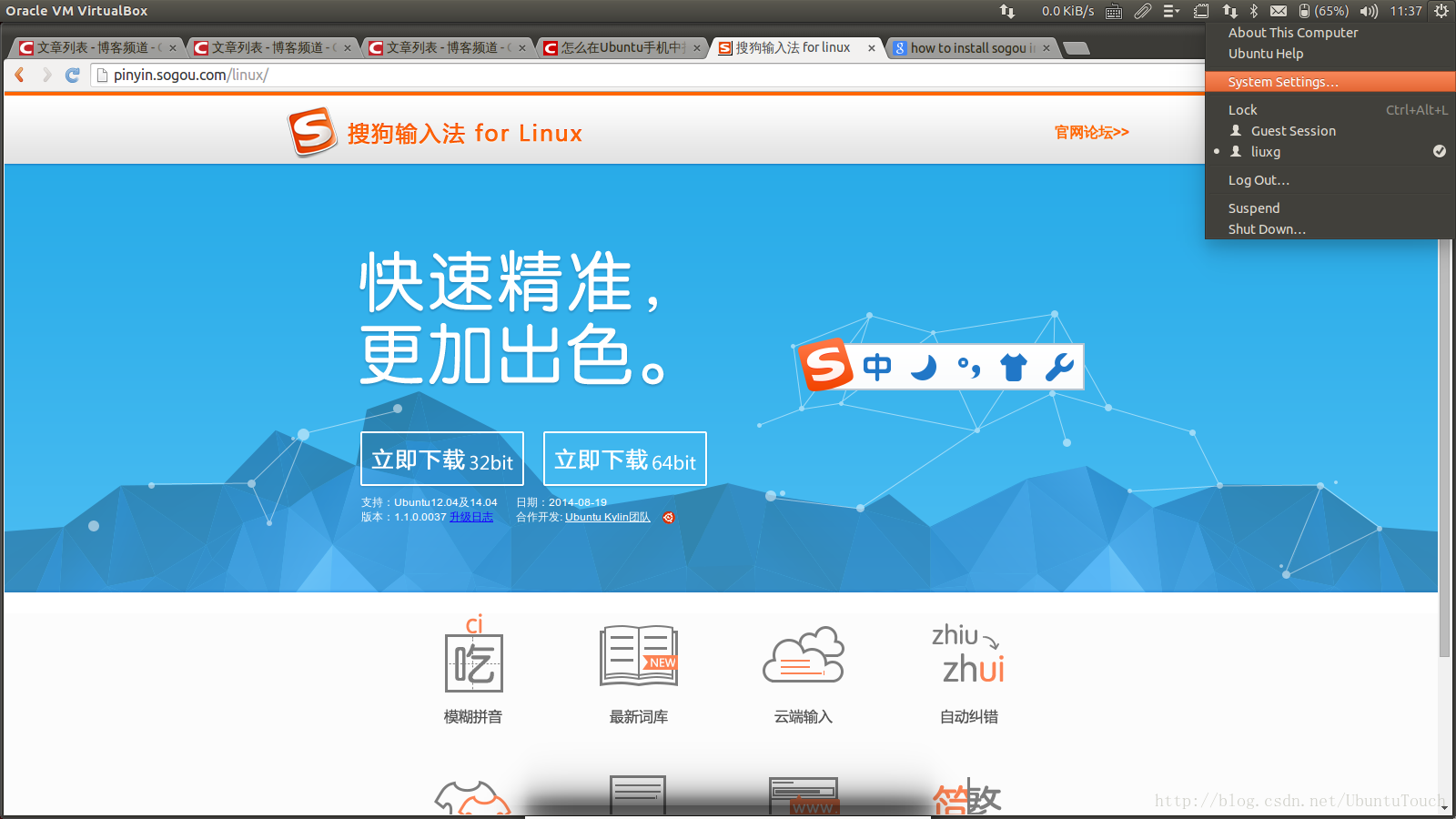http://pinyin.sogou.com/linux/”下载最新发布的搜狗输入法。根据自己CPU的位数,下载合适的版本。