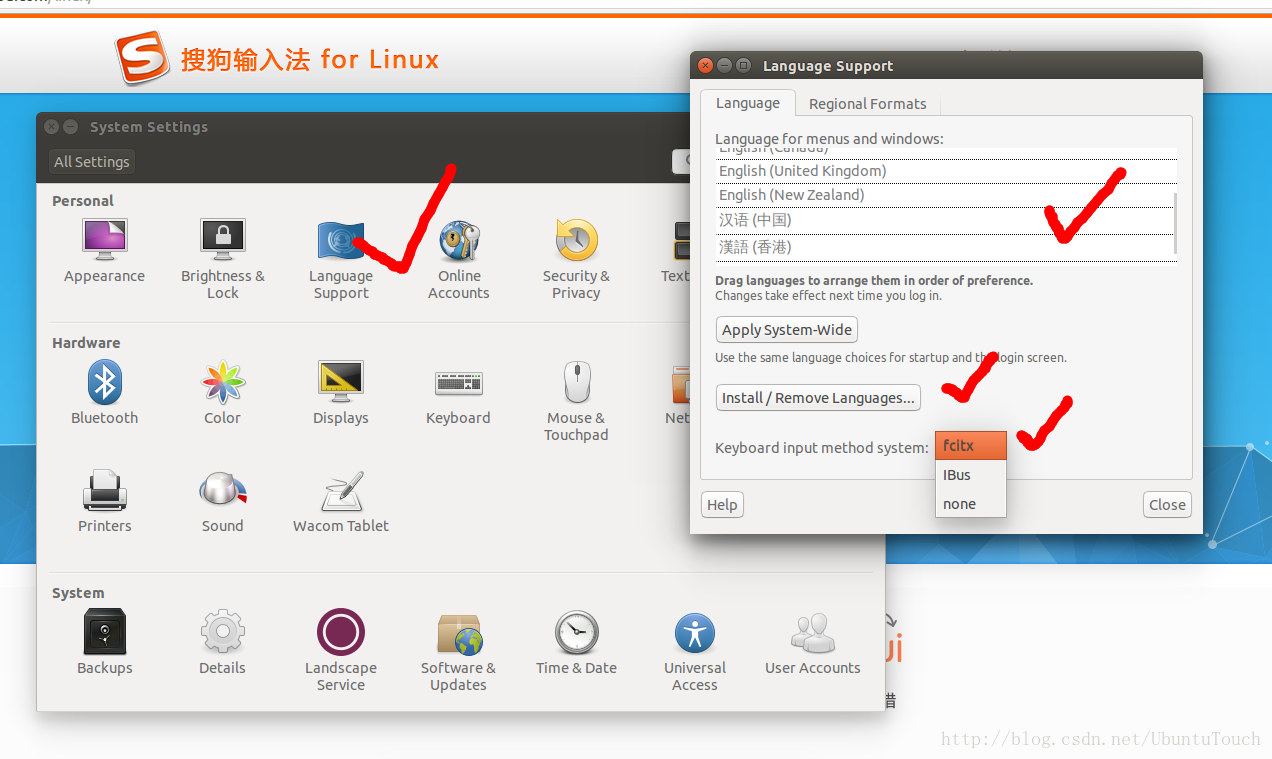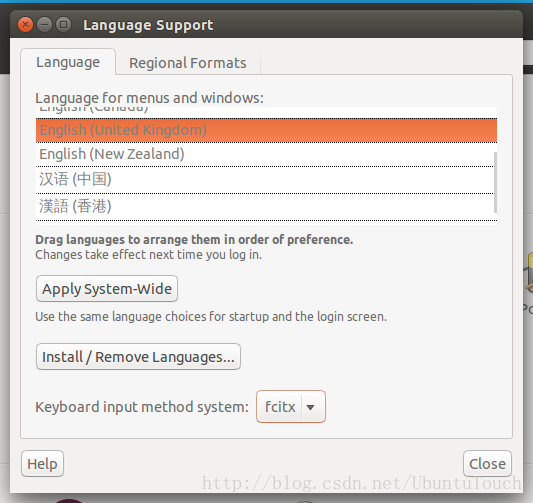 如果你的系统还没有安装中文的话,请选择“Install/Remove Languages...”来安装对中文的支持。并同时选择“fcitx”。最终的画面为: