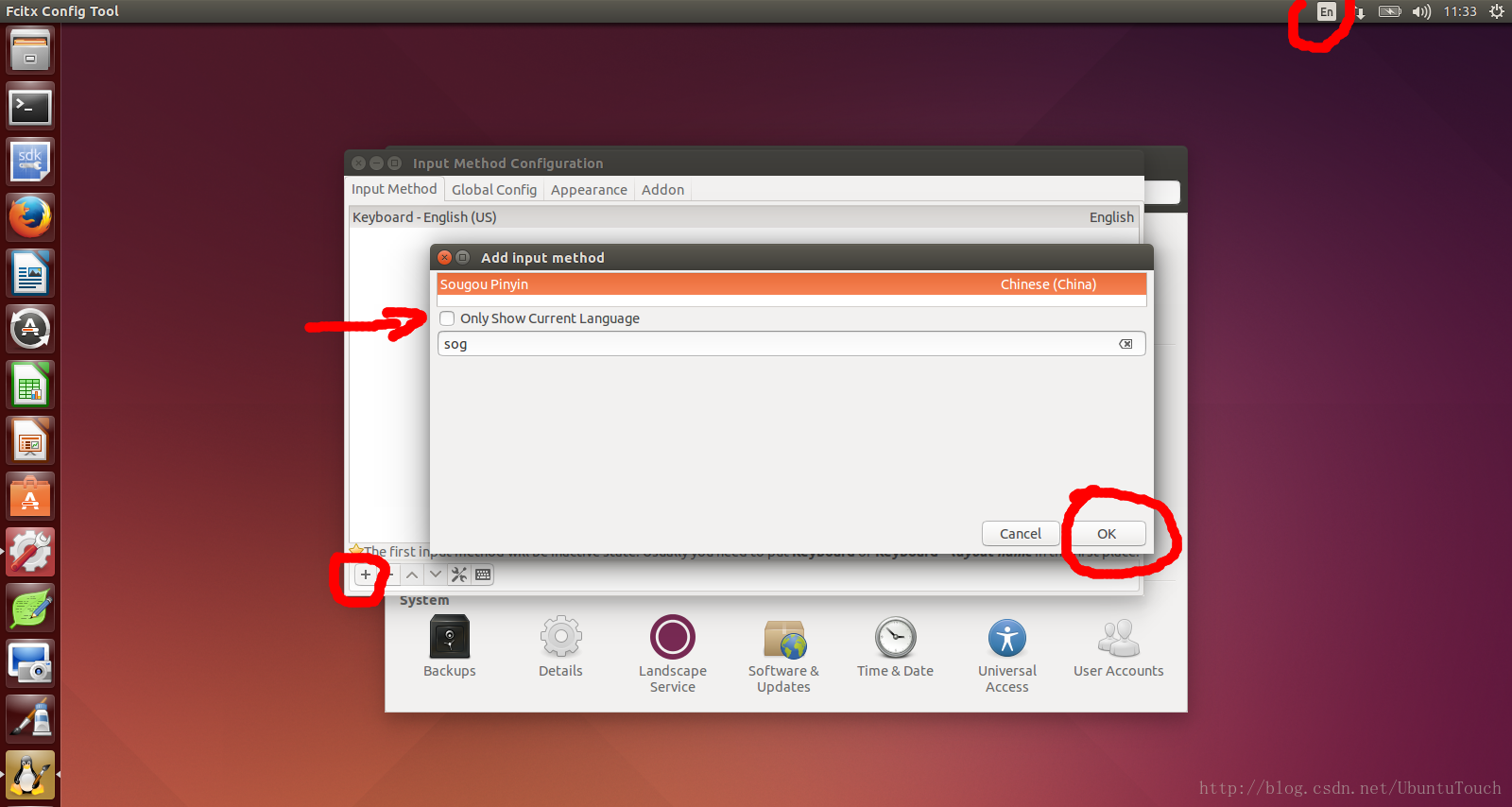 选择最后的一个“Text entry”项,并点击“+”来添加搜狗输入法。点击“OK"。重新启动系统即可。