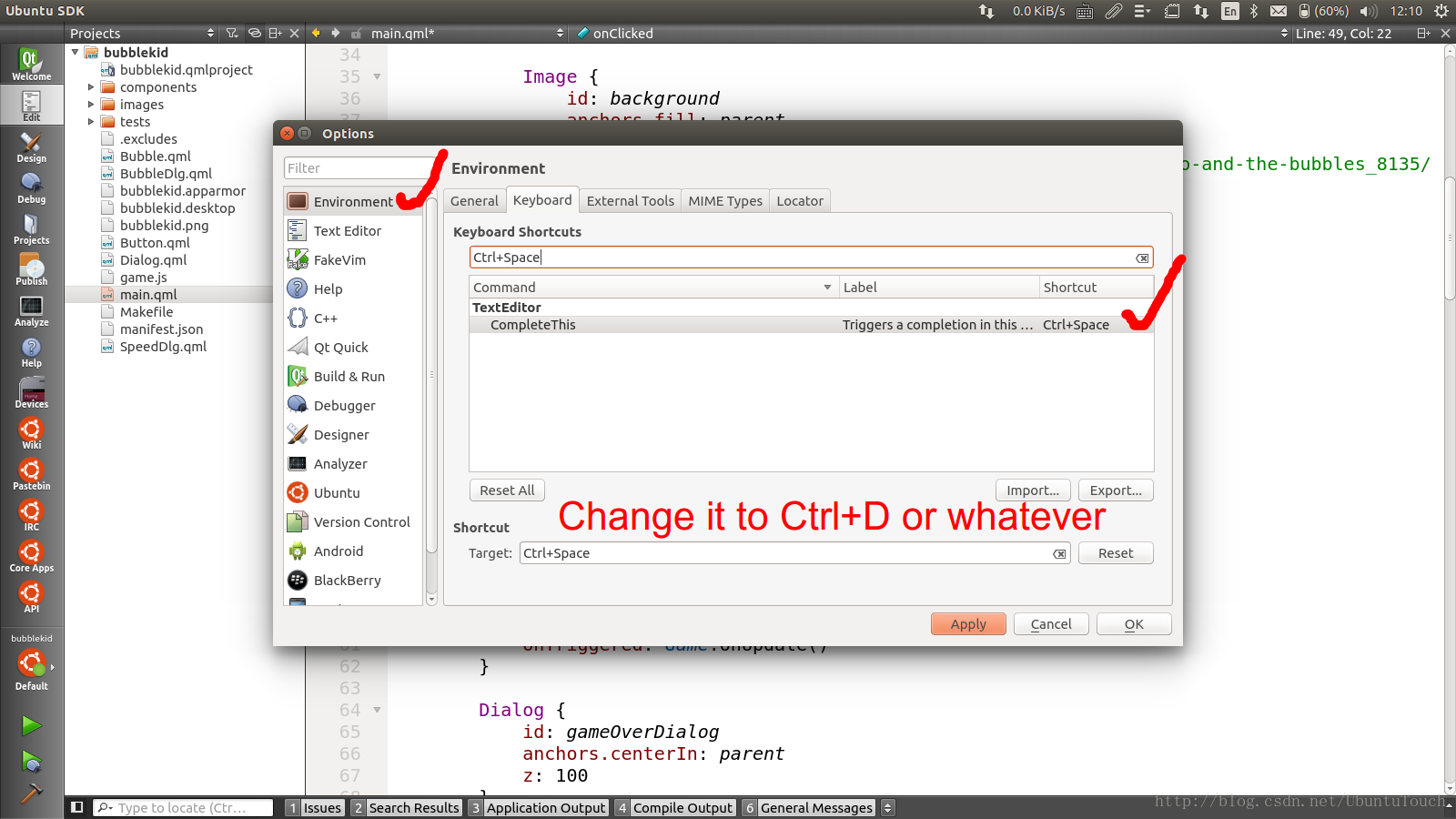Space时,在QML文件中会显示该item的properties。对于大多数已经适应中文输入法切换的开发者来说,我们可以修改Qt Creator中的设置来改变这个功能的热键。