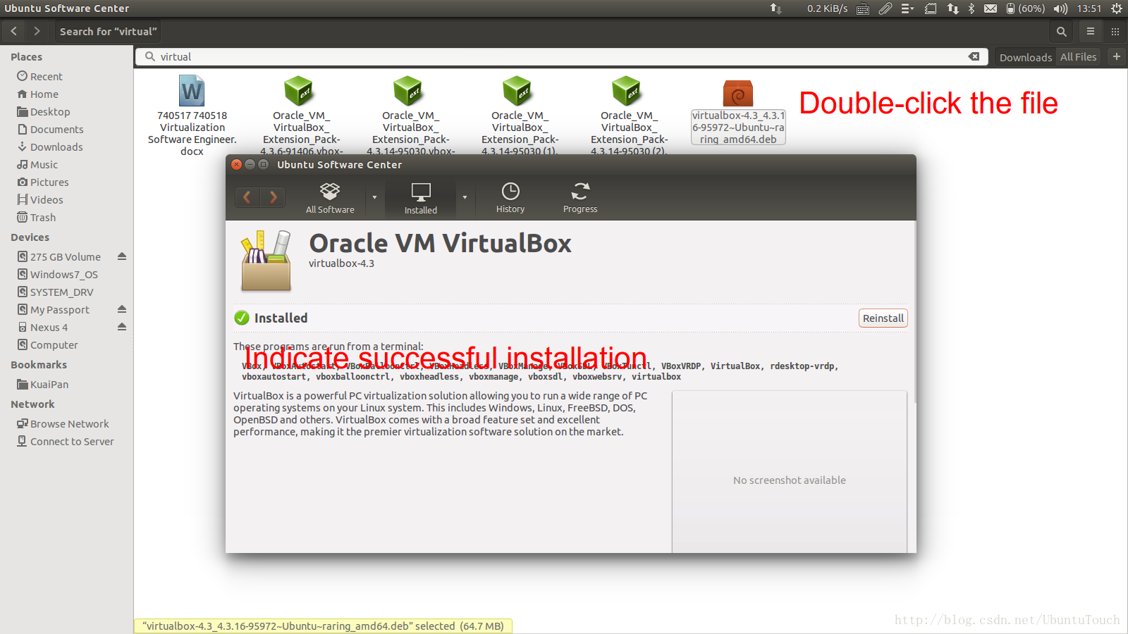 我们在Ubuntu OS或Windows下,双击刚刚下载的VirtualBox文件,系统会自动帮我们调用软件帮我们安装。在Ubuntu OS下的界面如下: