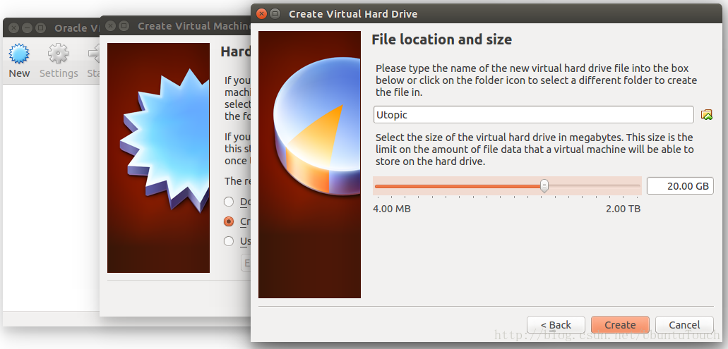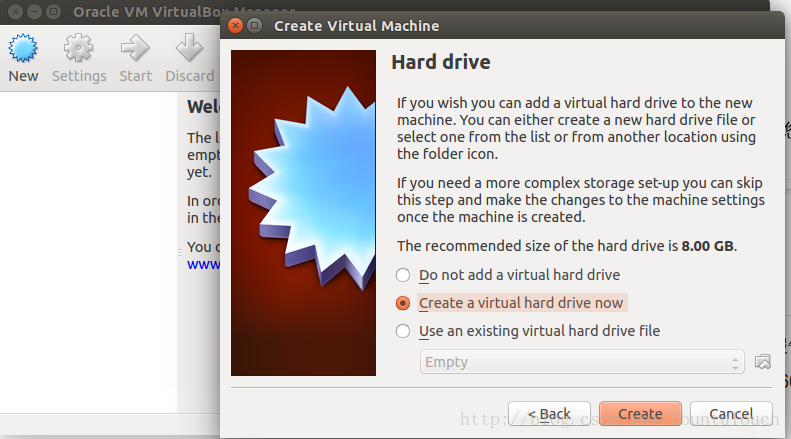Create a virtual hard drive now”。如果你曾经创建过,并存有一个virtual hard drive的文件,你可以直接选择“