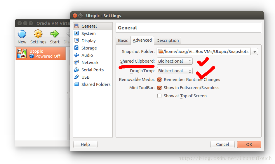 General”,我们可以设置可以在host及guest系统之间进行拷贝。这个对我们有时非常有用。
