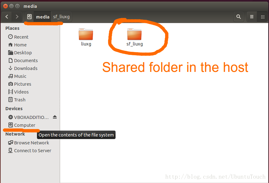 在VM中打开文件浏览器,即可看见Host中被分享的文件夹。文件名通常会有一个“