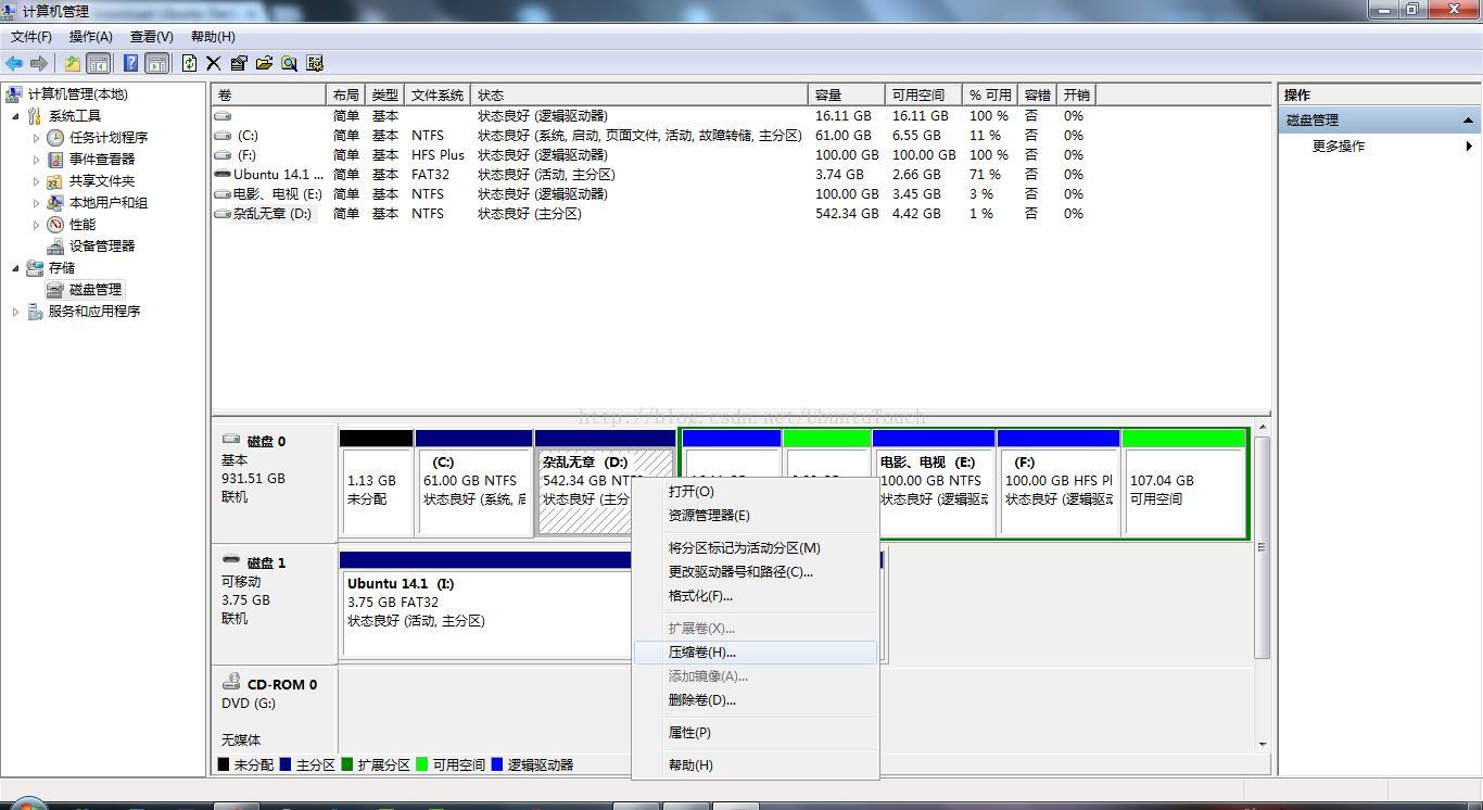 在一个硬盘分区上右键选择“压缩卷”,跟着步骤走,输入你想要磁盘大小。