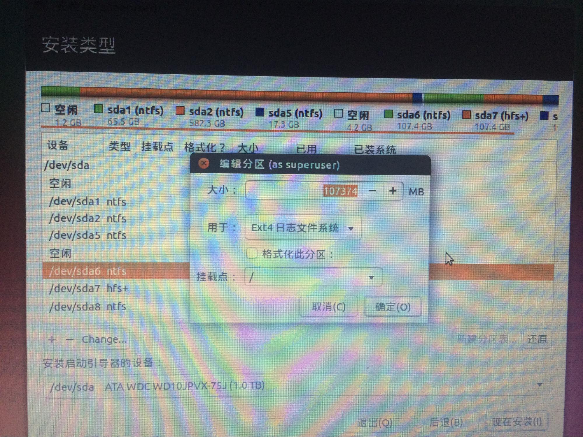 选择你刚刚在Windows下分出来的那个盘,选择“Ext4 日志文件系统” 挂载点“/”