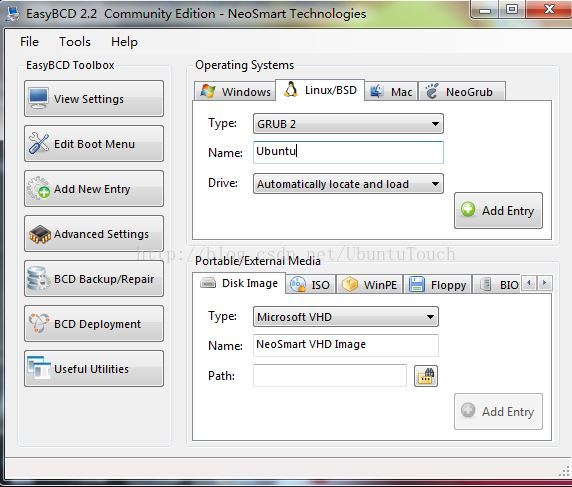 选择“Add New Entry”选择“Linux/BSD”——选择“GRUB2”并命名为Ubuntu,点击“Add Entry”