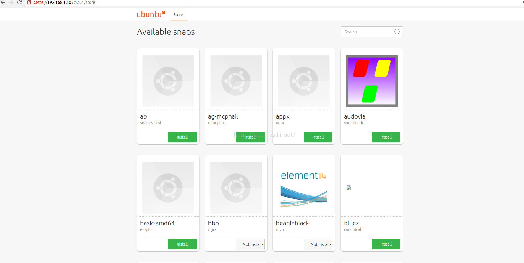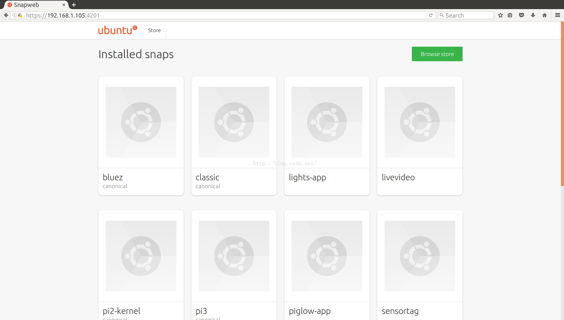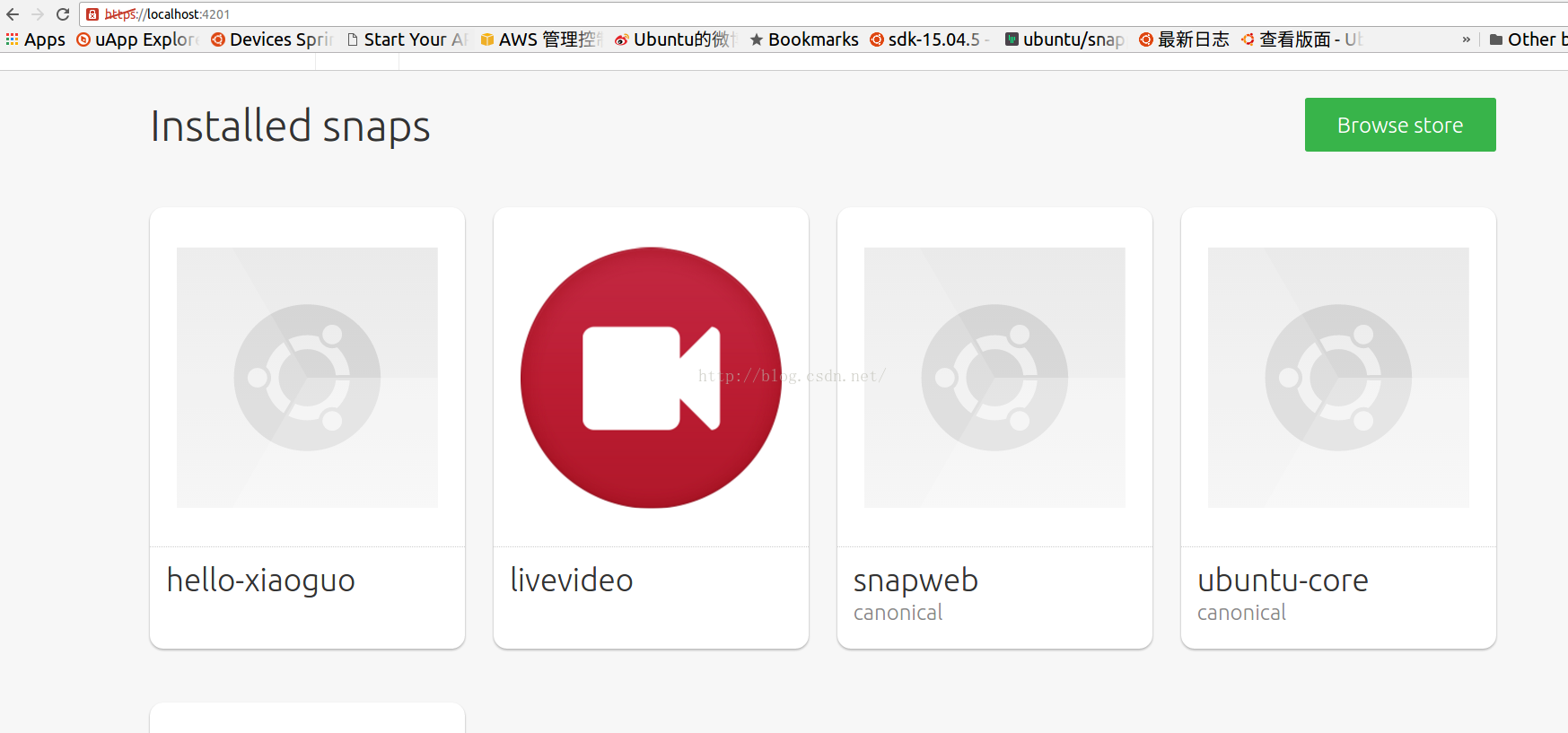 有了这个snapweb界面,我们可以对我们的应用进行管理,比如删除.当然我们也可以对我们的系统进行安装其它的已经在商店中的应用,就像我们文章开始介绍的画面一下.