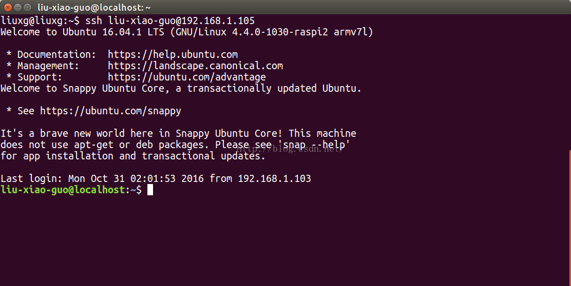 来逐一试上面的每个地址.如果成功的话,我们会进入到ubuntu core的登陆环境.这里注意的是"liu-xiao-guo"是我在 launchpad上的用户名.开发者必须根据自己的账号进行修改.