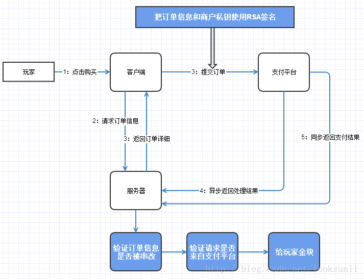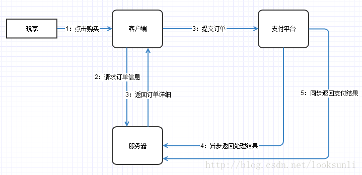 注意: 4,5执行顺序不确定,步骤4是支付平台自动向服务器请求,步骤5是玩家点击“返回商家网站”时支付平台请求服务器,如果玩家不点击,这可能不会触发,所以这是一个不可靠的请求。