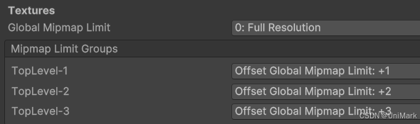 举例说明:假设纹理本身应用Mipmap Limit Group TopLevel-3,在原始纹理等于Lv12的情况下,应该输出Mipmap Lv9,此时,再通过代码设置Offset = 3,那么最终的Top Mipmap Level会是6,通过代码控制与通过纹理的 Mipmap Limit Group控制是叠加关系。