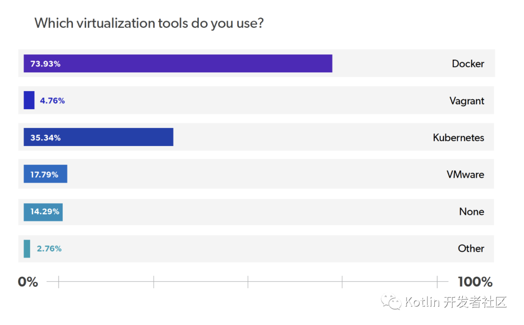 With the way Kubernetes has grown it wouldn’t be surprising to see it play a dominating role in the market in coming years. VMware and Vagrant made up the last two significantly used tools, with 18% and 5% usage respectively. Lastly, 14% of respondents reported not using a virtualization tool.